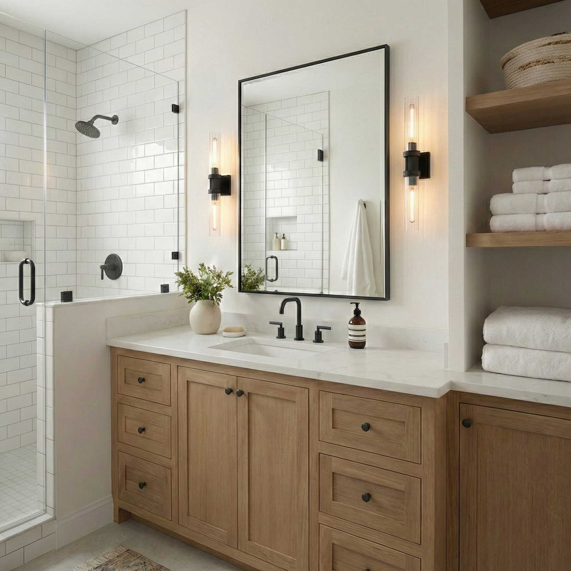 - Wyróżnij strefę lustra - czarna oprawa stanowi doskonałą ramę dla strefy umywalkowej