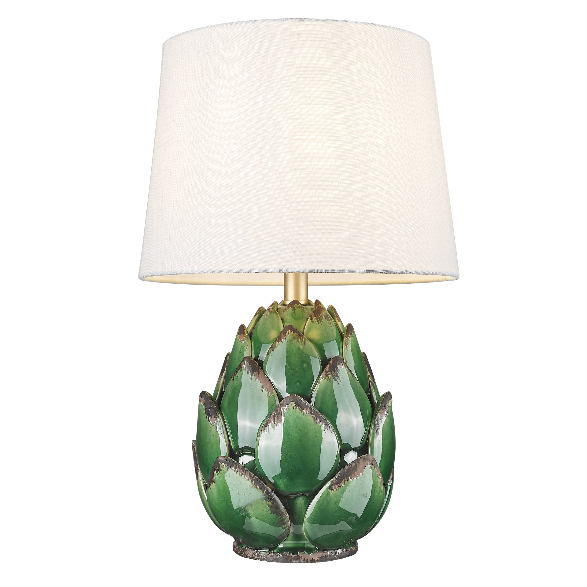 Dodaj wnętrzu wyrazistego charakteru dzięki designerskiej lampie stołowej inspirowanej formą karczocha - dekoracyjnemu połączeniu natury i elegancji. Rzeźbiarska podstawa przyciąga wzrok organiczną formą, a biały abażur z tkaniny i detale w wykończeniu szczotkowanego mosiądzu nadają całości luksusowego, dopracowanego wyglądu.