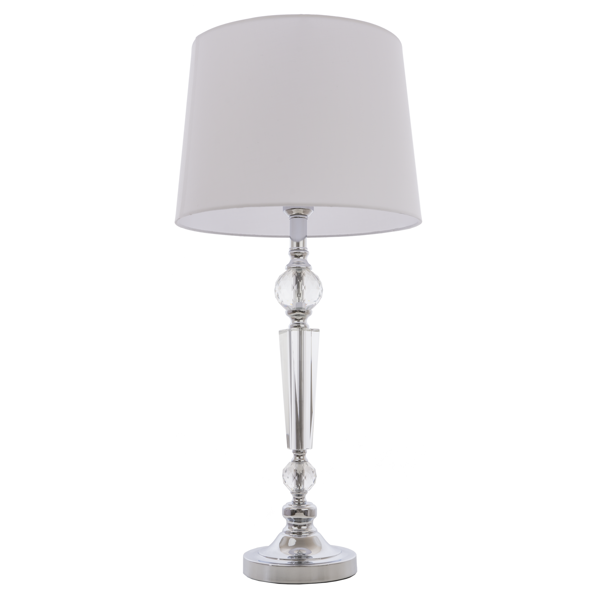 Lampę stołową CHARLOTTE wyróżnia przejrzyste, ciężkie szkło kryształowe oraz biały okrągły abażur.