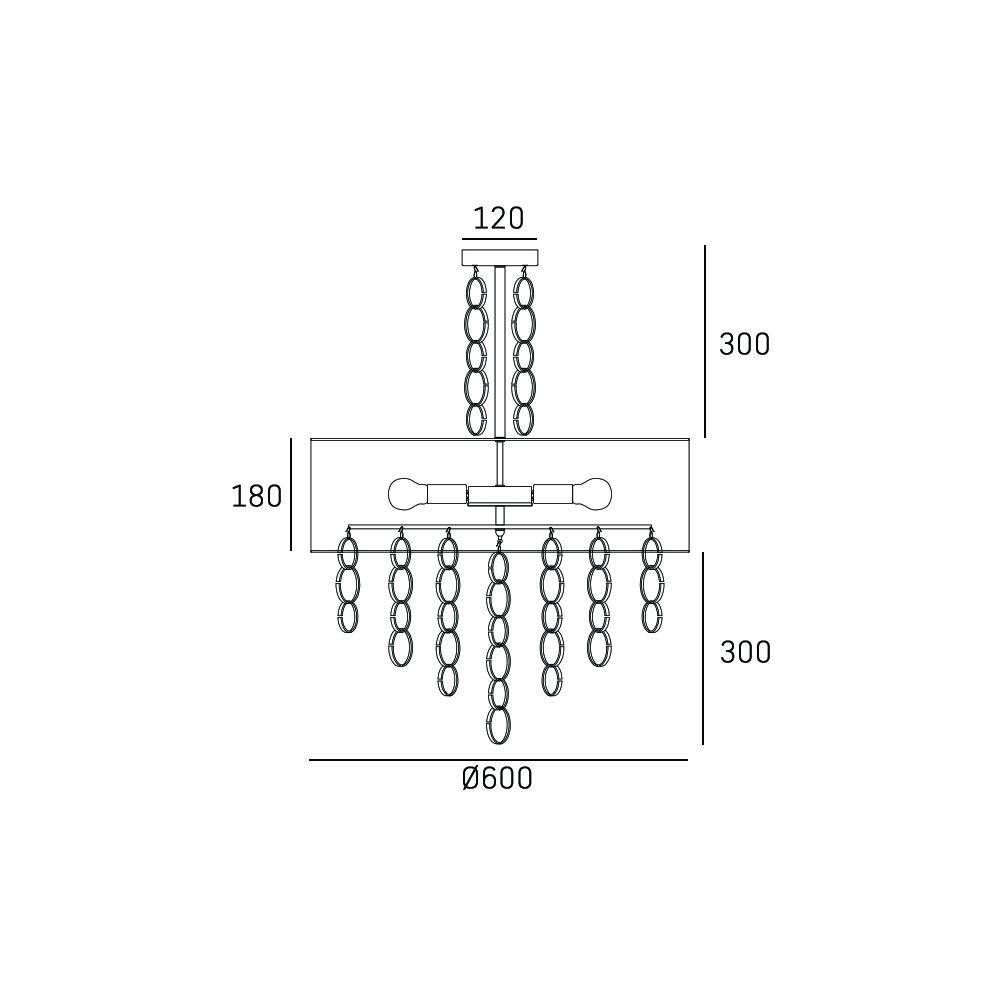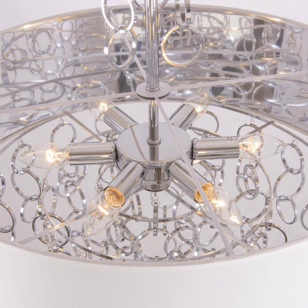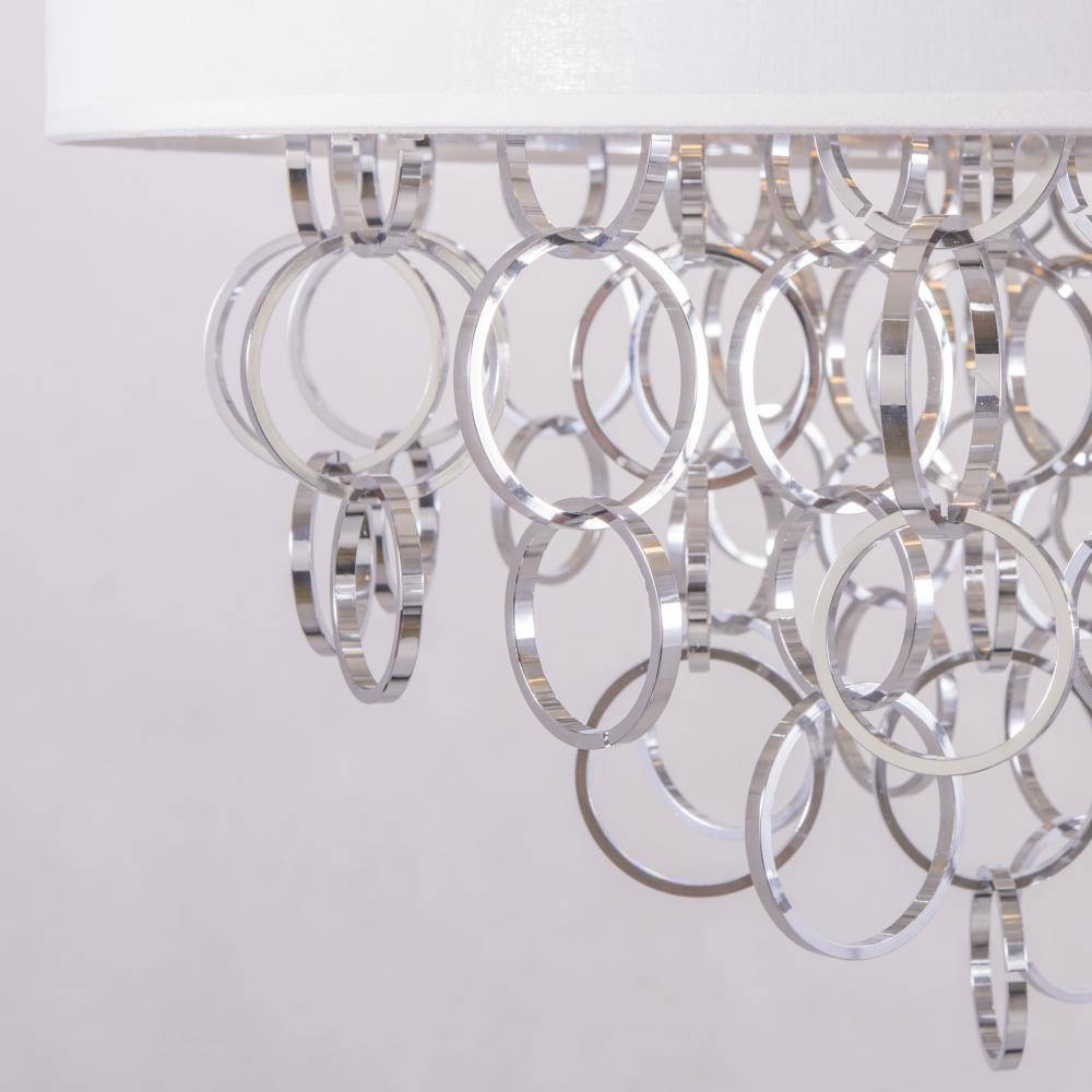 CAIRO to imponująca lampa wisząca w stylu nowoczesnym - kapitalna propozycja do salonu. Ten żyrandol zbudowany jest z delikatnej ramy, na której zawieszone są duże, okrągłe ogniwa w kolorze chrom. Abażur z zewnątrz jest koloru białego, a we wnętrzu srebrny dzięki czemu nie tylko lepiej odbija światło, ale również i samą lampę.