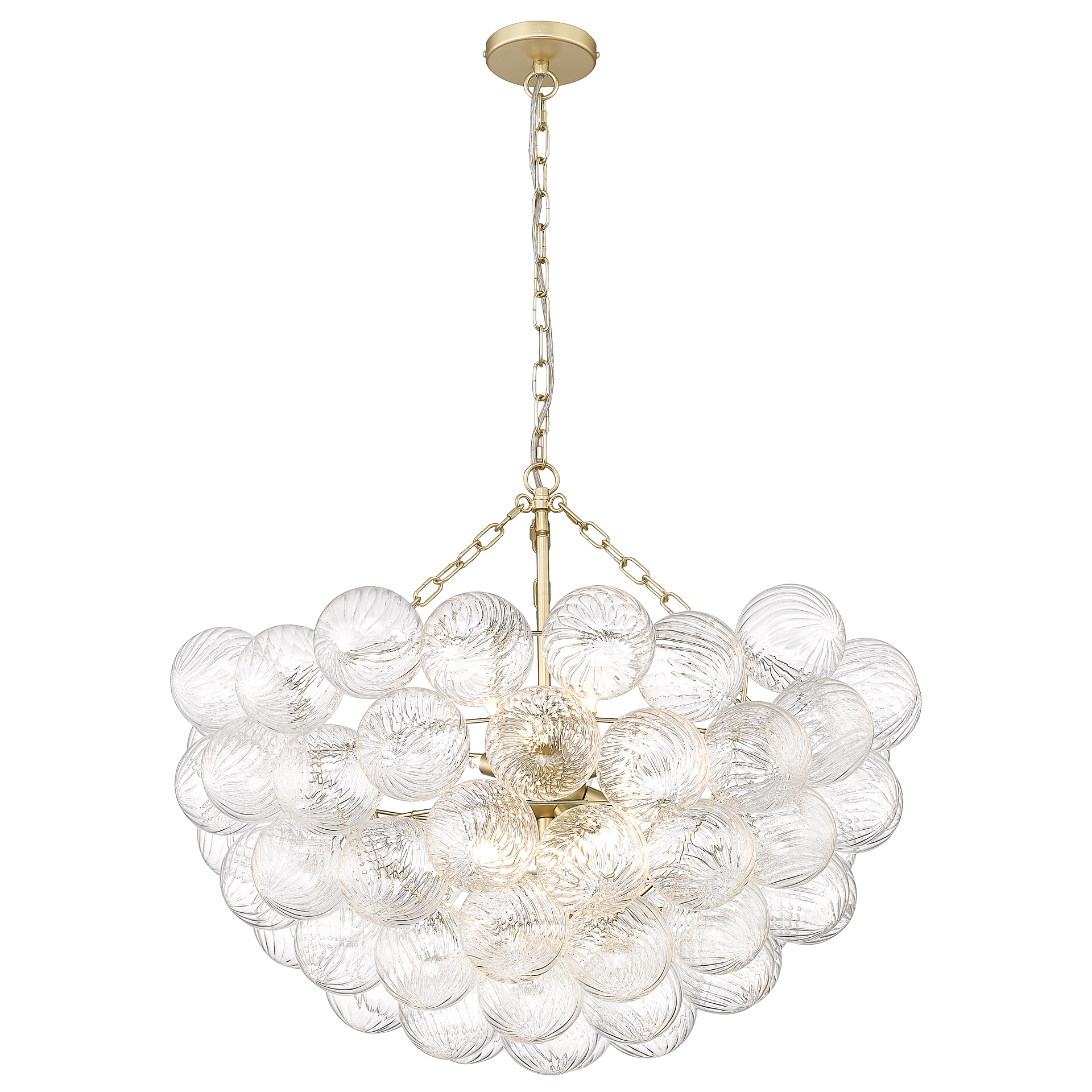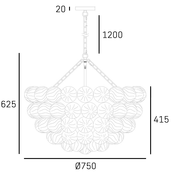 Dodaj wnętrzu spektakularnego charakteru dzięki efektownej lampie wiszącej, zbudowanej z wielu szklanych kul tworzących świetlistą, dekoracyjną bryłę. Połączenie transparentnego, strukturalnego szkła z metalowymi detalami w ciepłym, szlachetnym wykończeniu sprawia, że lampa staje się centralnym punktem aranżacji.