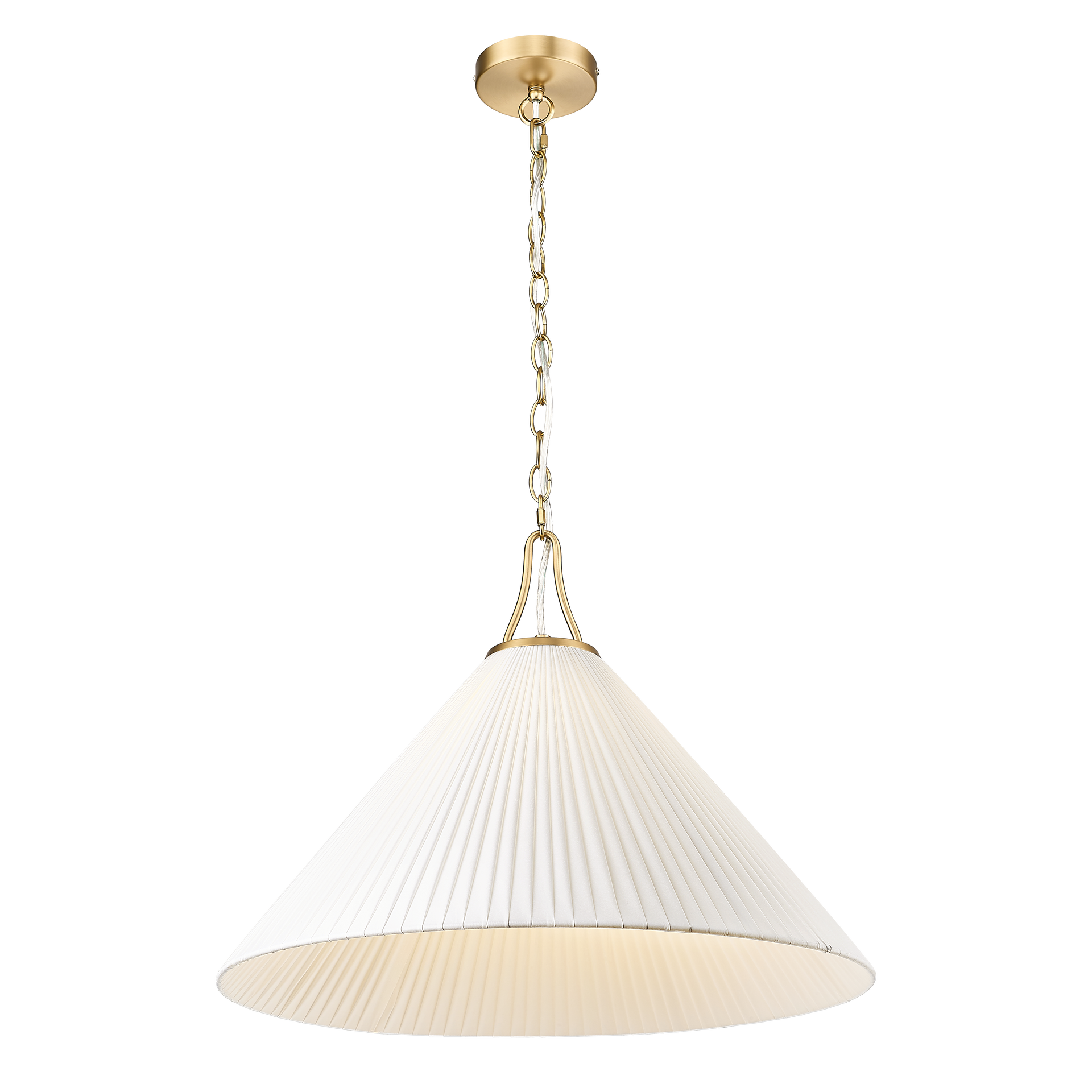 - Szczotkowany Mosiądz (BR): Metalowe wykończenie w postaci klasycznego łańcucha oraz charakterystycznego, wygiętego uchwytu zwieńczającego abażur, stanowi luksusowy i ciepły akcent kontrastujący z bielą tkaniny.