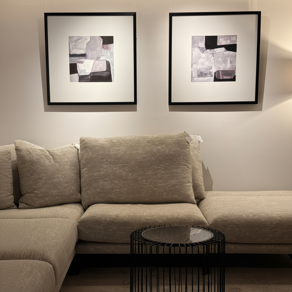 ASH operuje oszczędną kreską i oddechem bieli — to nowoczesny obraz abstrakcyjny w ramie w kolorze czarnym, z passe-partout i szkłem. Dominujące kolory: grafit, szarość, biel. Siostrzana wersja o innym układzie linii — idealna do ekspozycji w duecie po bokach konsoli lub łóżka.
