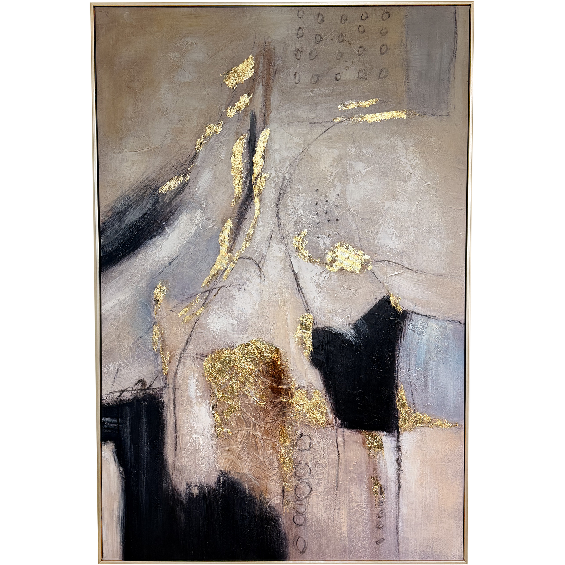 AURUM operuje subtelną grą półtonów — jasne pola i miękkie przejścia budują nastrojową, horyzontalną kompozycję. To nowoczesny obraz abstrakcyjny w ramie w odcieniu szampańskiego złota, malowany na płótnie z grubą fakturą. Paleta: beż, taupe, biel.