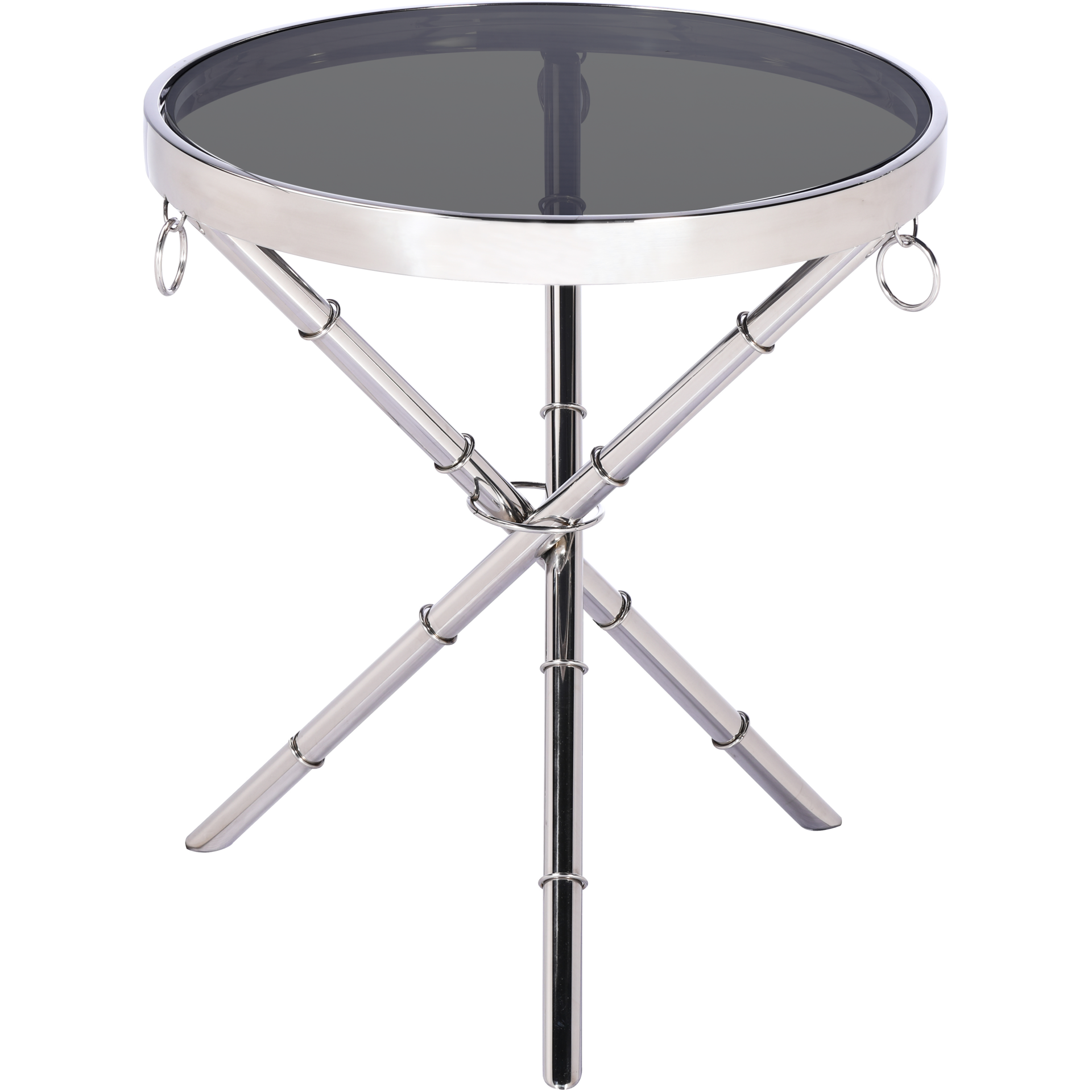 Okrągły stolik boczny na trzech nogach inspirowanych wyglądem bambusa, wygląda wręcz fenomenalnie. Srebrna rama, nogi oraz okrągłe uchwyty po bokach łączą całość w naturalne dzieło sztuki. Na górze zastosowano dymione szkło, które idealnie wpasowane jest w ramę.