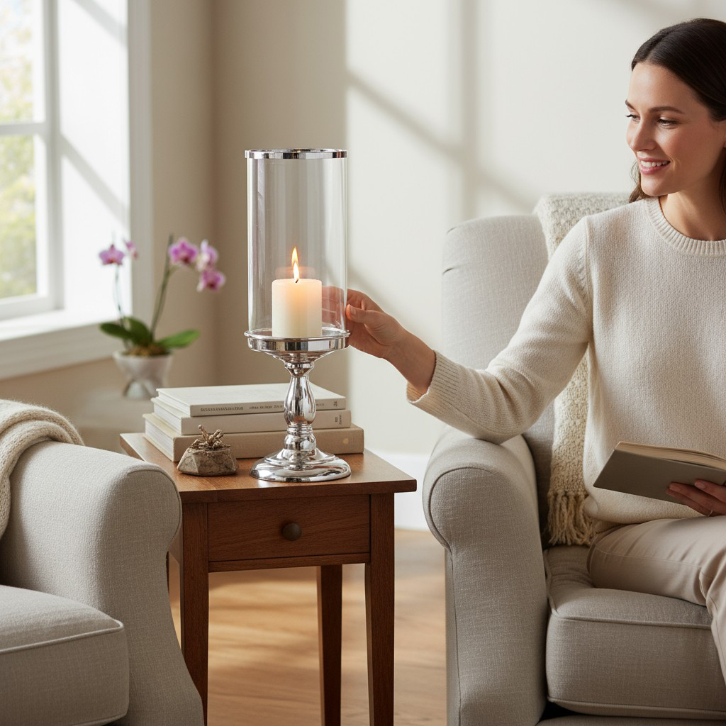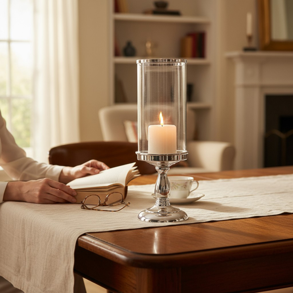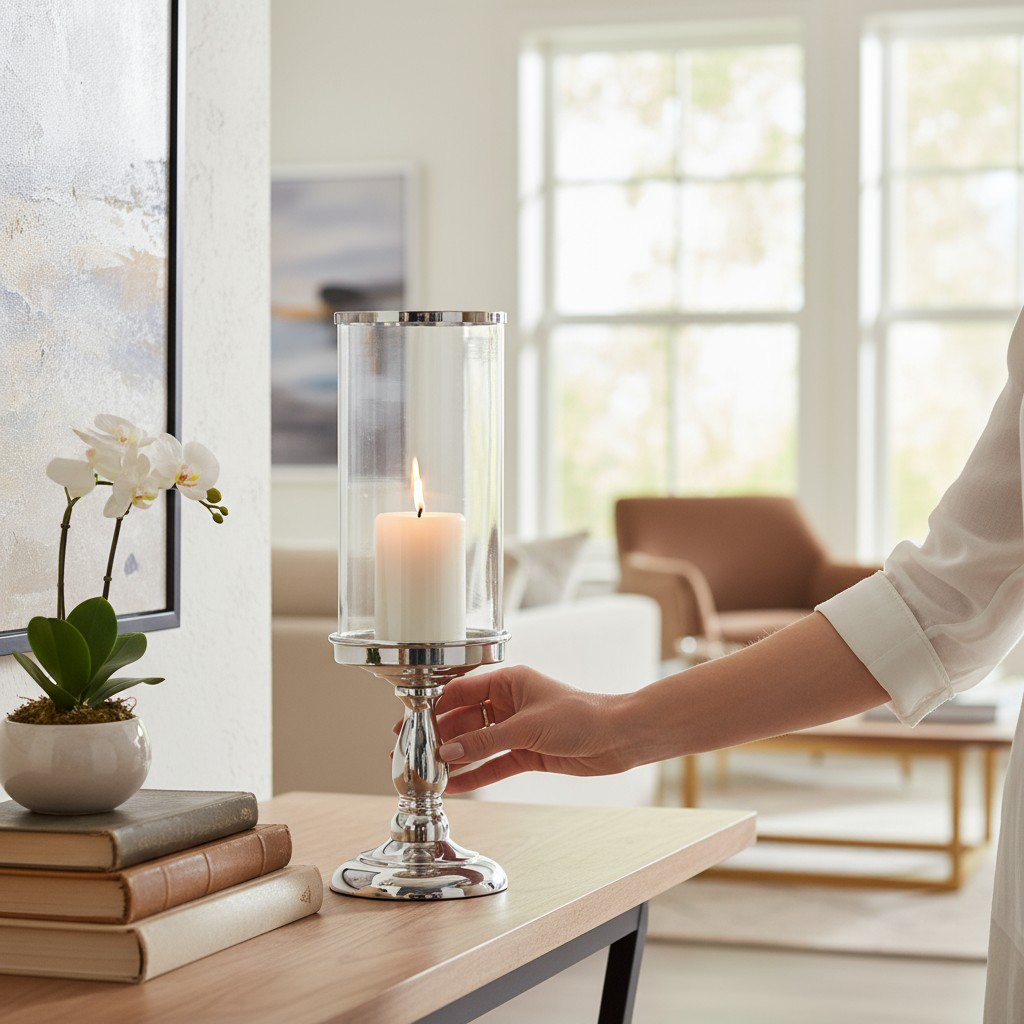 Świeczniki z serii Connor wykonane są z niklowanej stali i szklanego klosza, wykończonego obejmą.