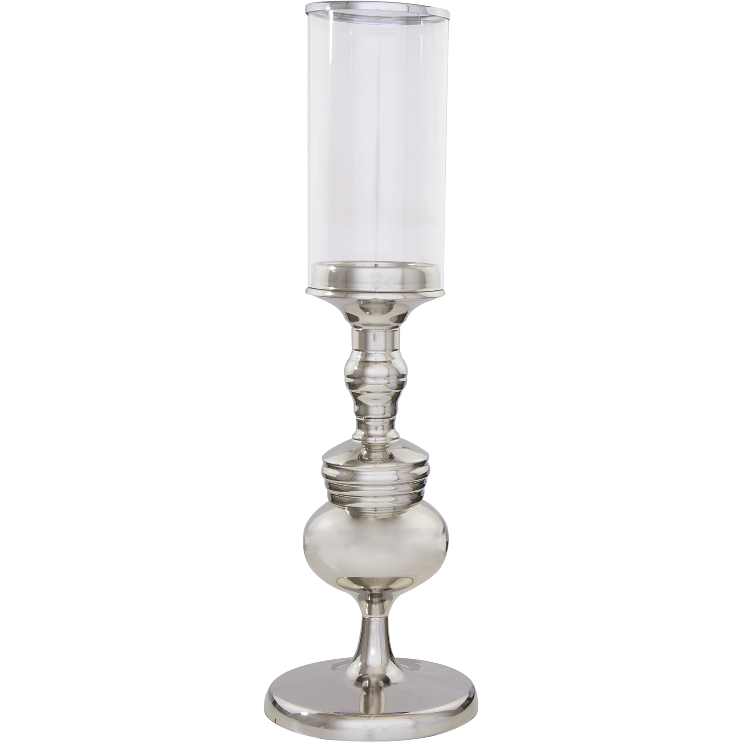 Klasyczny świecznik Lincoln wykonany jest niklowanej stali i szklanego klosza, wykończonego obejmą.